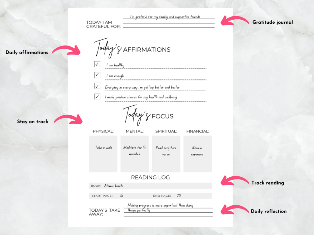 - Daily reflection section to help you stay mindful and reflect on your progress
